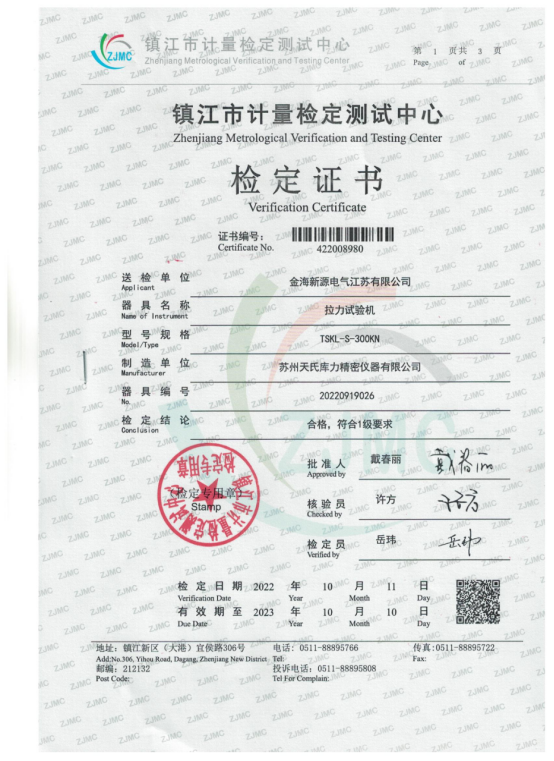 鎮江市計量檢定測試中心檢定證書