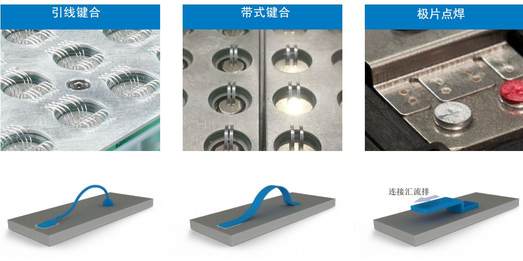 圖3 超聲引線鍵合、帶式鍵合和極片點焊。