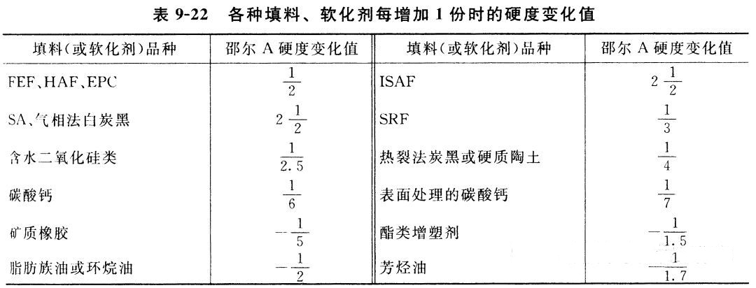 在實際配方設計時,當已確定主體材料、硫化體系,根據不同填料對橡膠的補強效果和軟化劑的軟化效果來估計。通常將非填充橡膠的基本硬度,加上填充劑增加的硬度減去增塑劑降低的硬度,來估計硫化膠最終的硬度。或者反過來,根據所要求的硫化膠的硬度估算填料和增塑劑的用量。